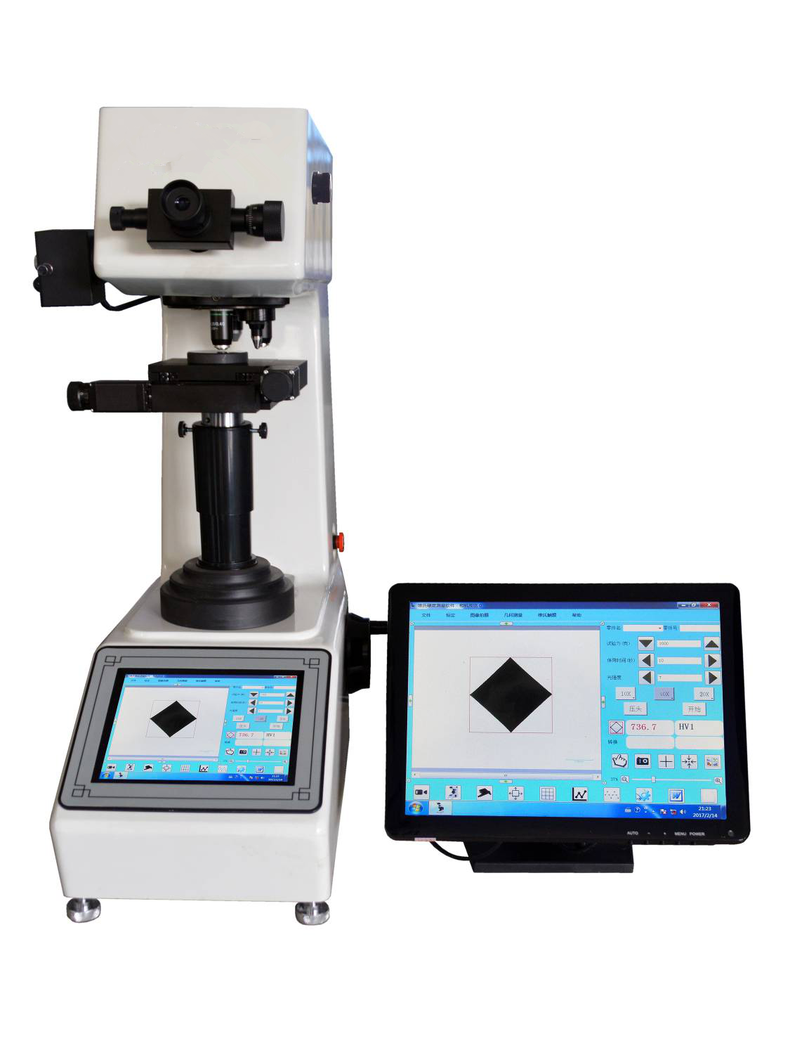 本儀器是新一代的全自動維氏硬度計與平板電腦一體化設(shè)計。搭載Windows 7操作系統(tǒng),具備電腦的所有功能。通過內(nèi)置CCD圖像采集系統(tǒng),在平板電腦上直接顯示測試的壓痕,觸摸屏按鍵,自動測試維氏(或努氏)硬度值,解決了顯微維氏硬度計用顯微鏡測量壓痕對角線長度的方式。避免了顯微鏡的光源給眼睛帶來的刺激和視覺疲勞,保護了試驗人員的視力。